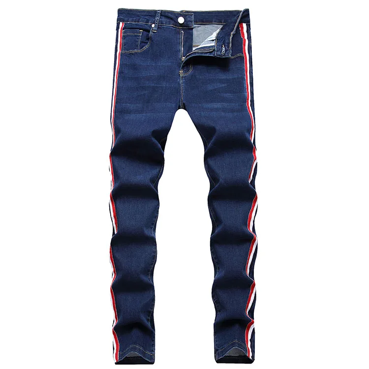 Four Seasons Men Side Stripe Denim Jeans Casual Navy Blue Stretch Pants Plus Size 40 42 Slim Male Straight Trousers