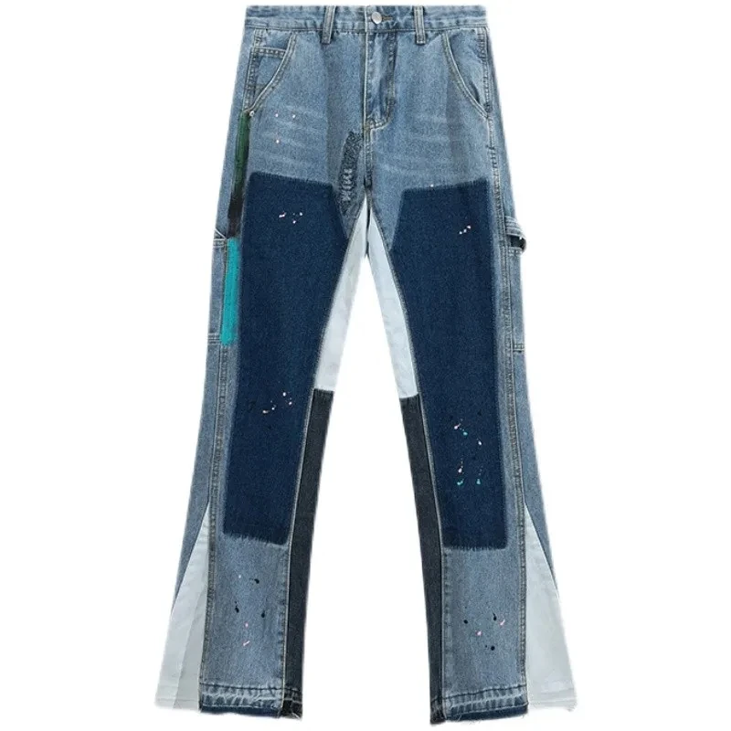 High Quality Blue Custom Logo Flare Legs Patch Vintage Washing Custom Denim Men’s Distressed Washed Jeans