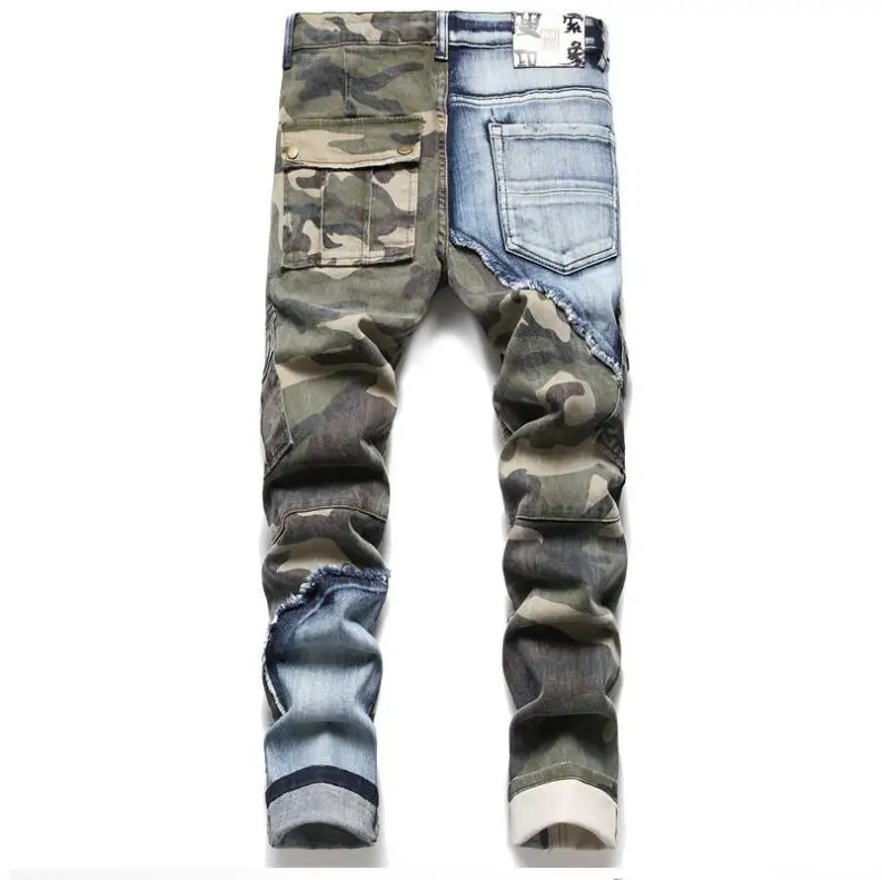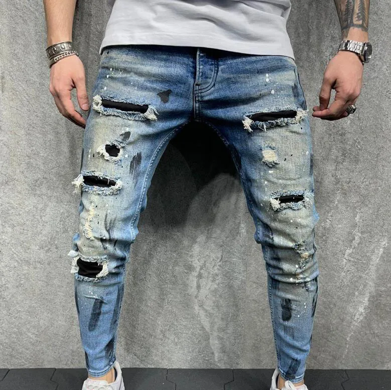 Men Printed Stretch Denim Jeans Streetwear Patchwork Painted Biker Pants Holes Ripped Distressed Slim Tapered Trousers