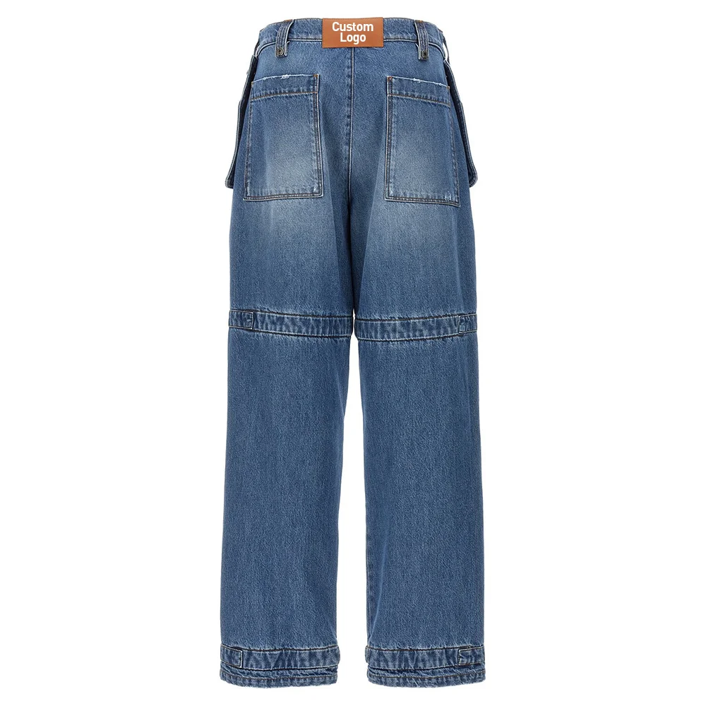 OEM High Quality Flap Multi-Pocket Vintage Blue Washed Style Wide Leg Men Functional Cargo Jeans