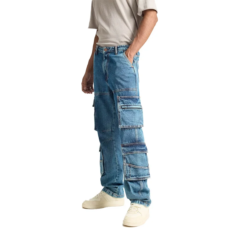 Custom Fashion Mens Straight Denim Cargo Pants Jeans Men Baggy Loose Blue Jeans With Side Pockets Jeans men