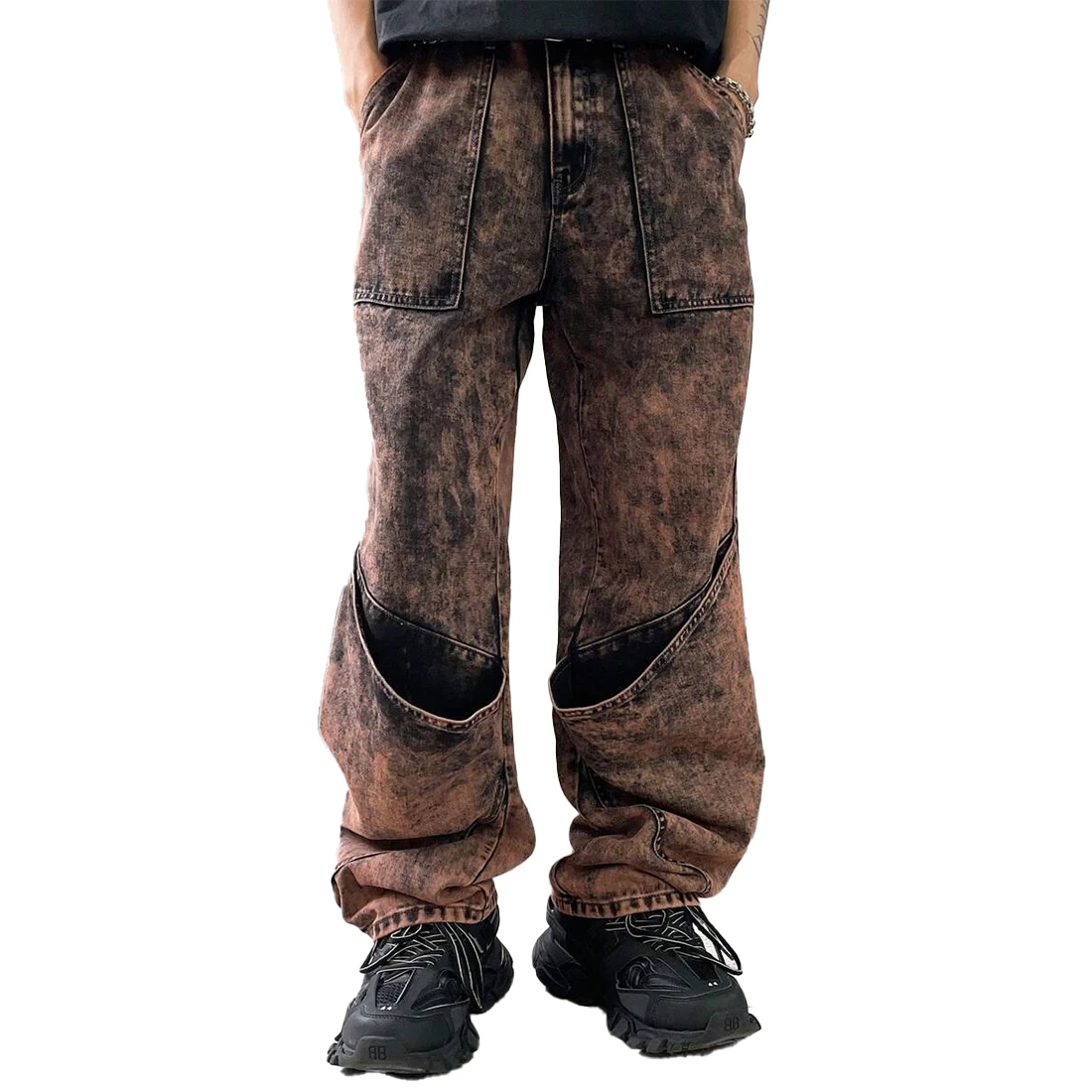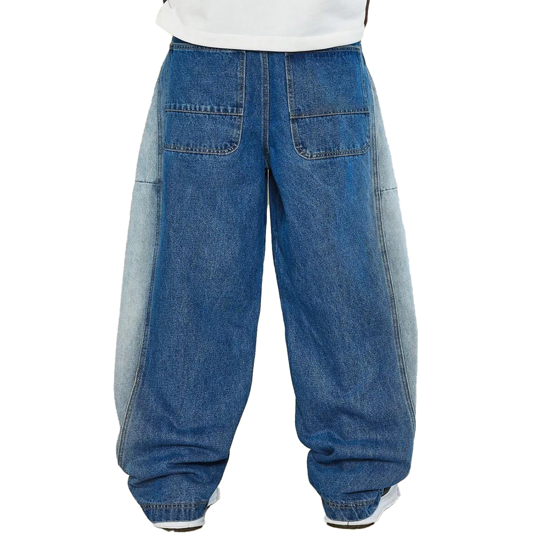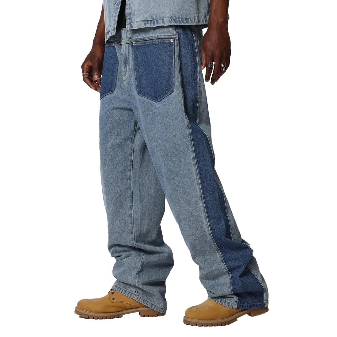 XUCHANG Men Custom Manufacturer Streetwear Baggy Denim Color Block Patch Pocket Side Panel Jeans Pants