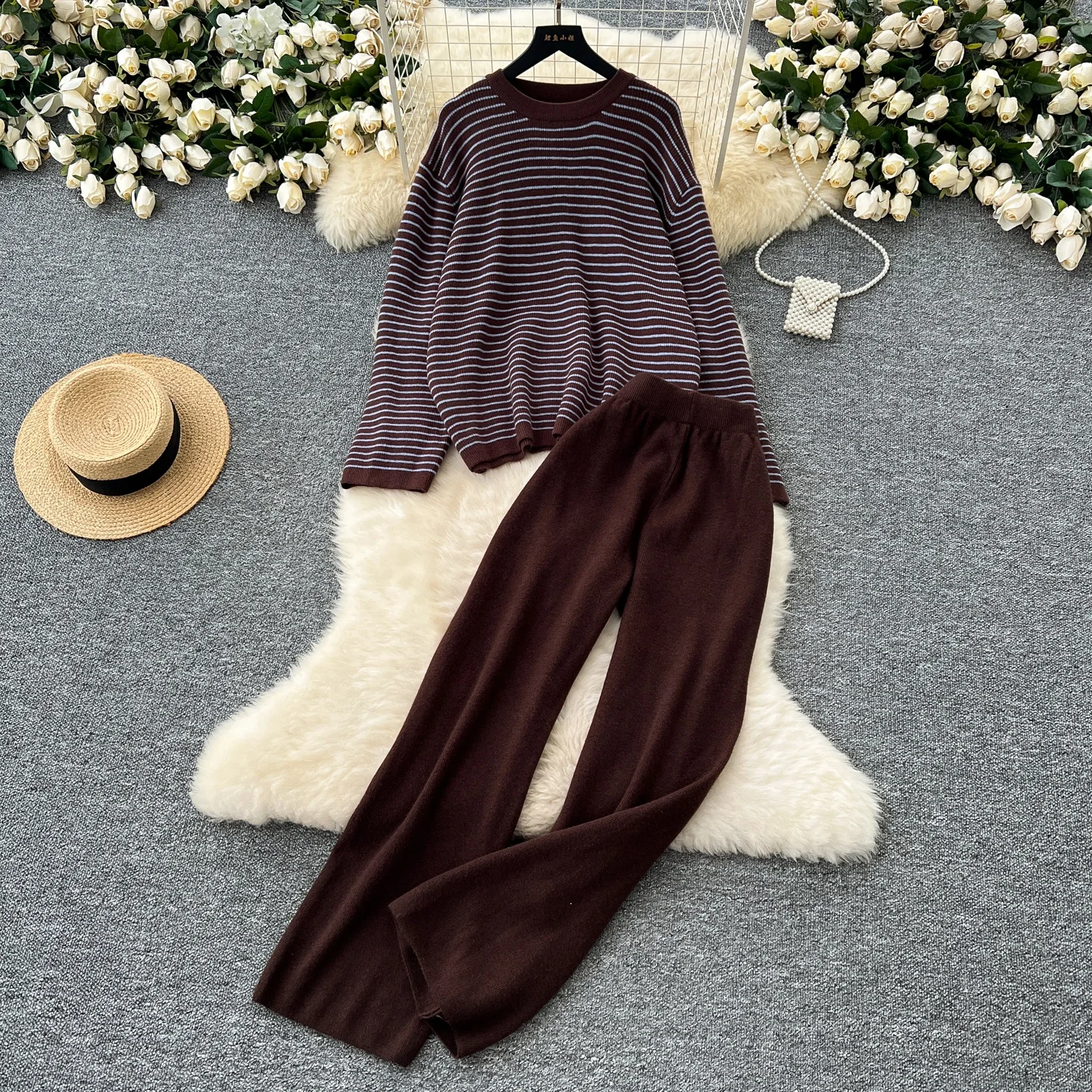 New autumn and winter collection contrasting stripes V-neck niche design knitted top high waist wide leg pants, two-piece set