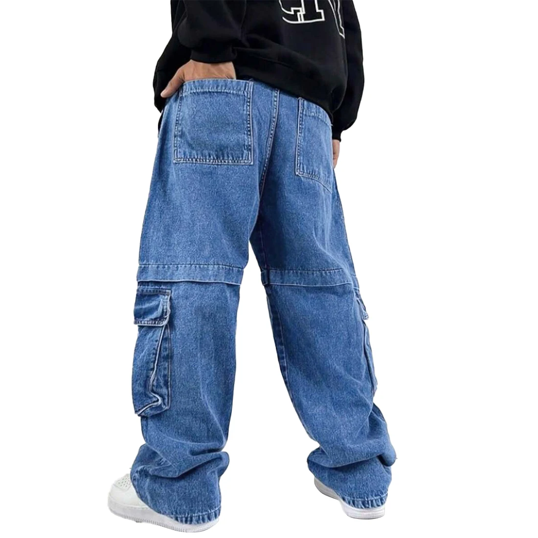 XUCHANG Fashion Streetwear Custom High Quality Men Baggy Washed Denim Cargo Pockets Loose Fit Jeans Pants