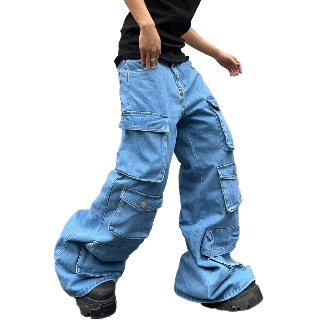 XUCHANG Custom Streetwear Men Baggy Washed Denim Cargo Pockets Wide Leg Loose Fit Jeans Pants Men