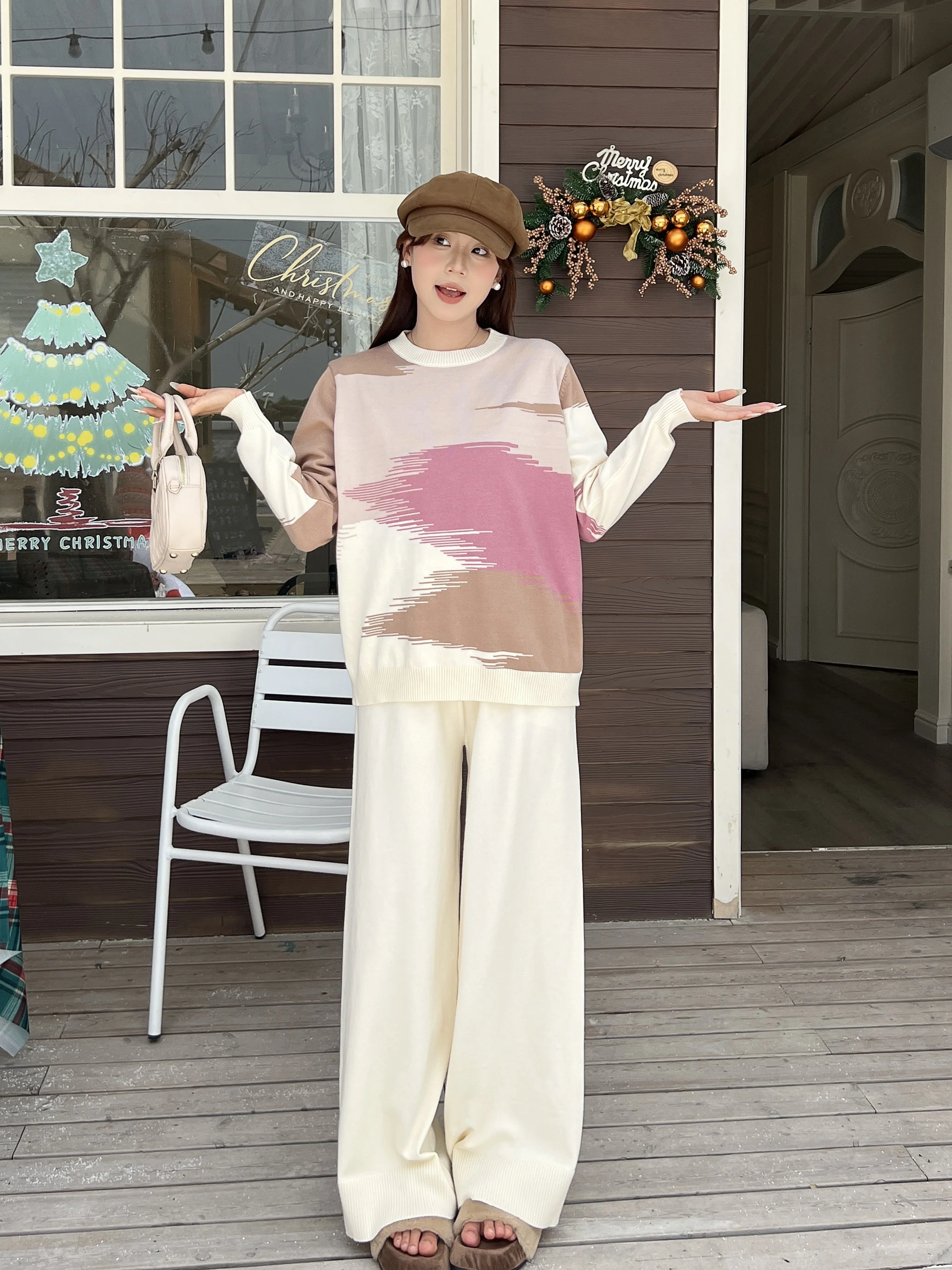 Round neck contrasting color autumn and winter new casual loose slimming wide leg pants knitted two-piece set for women