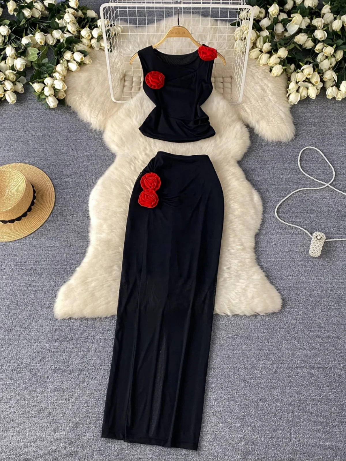 Women’s flower decoration hollow out chic vest top+slim fit hip hugging skirt two-piece set