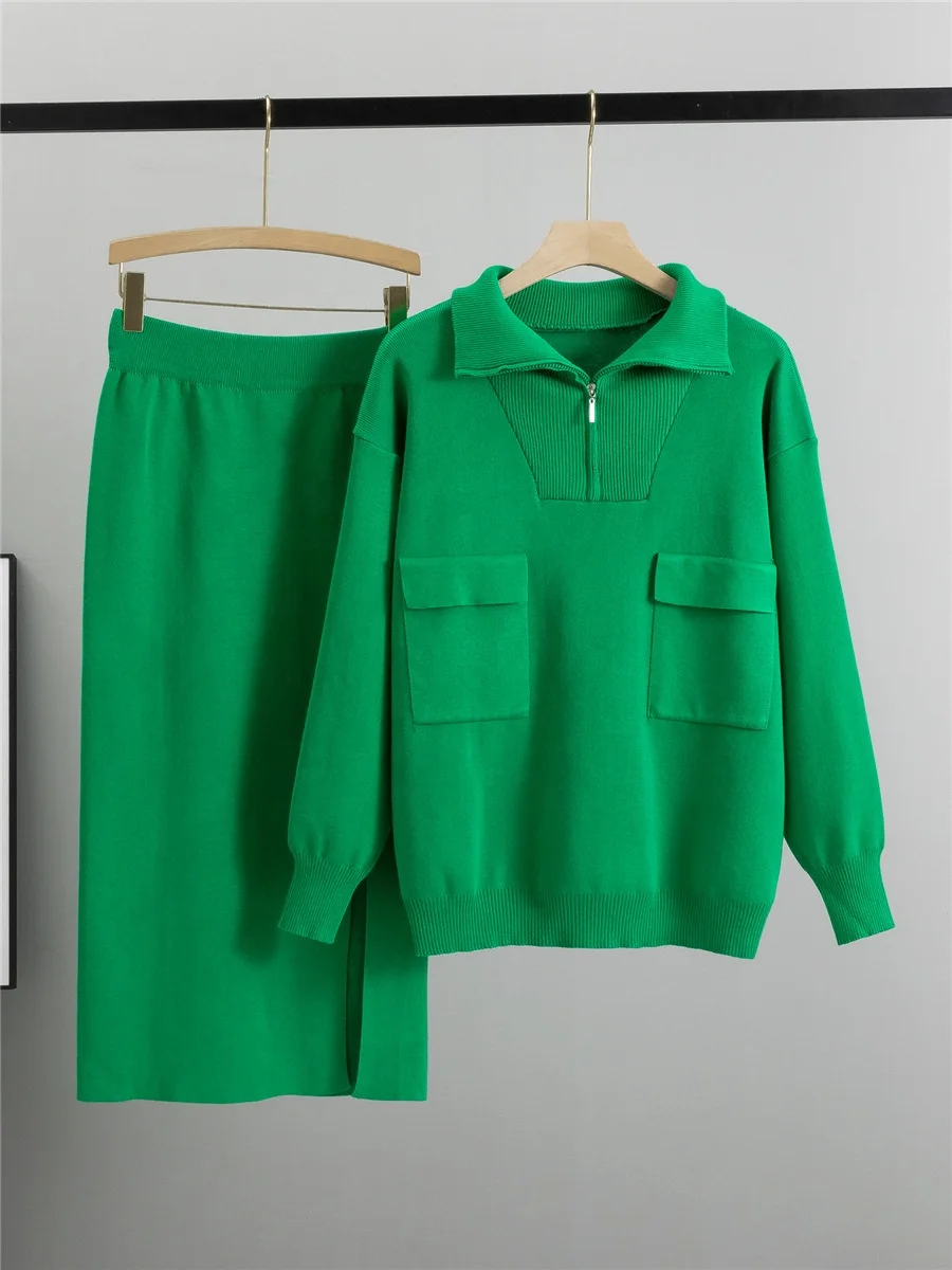 New Solid Color Collar Half Zipper Knitted Top+Temperament Bag Skirt Fashion Two piece Set Trendy