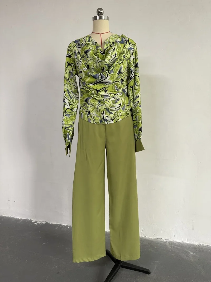 Spot Women’s Spring New Printed Lantern Sleeve Shirt Wide Leg Pants Casual Suit