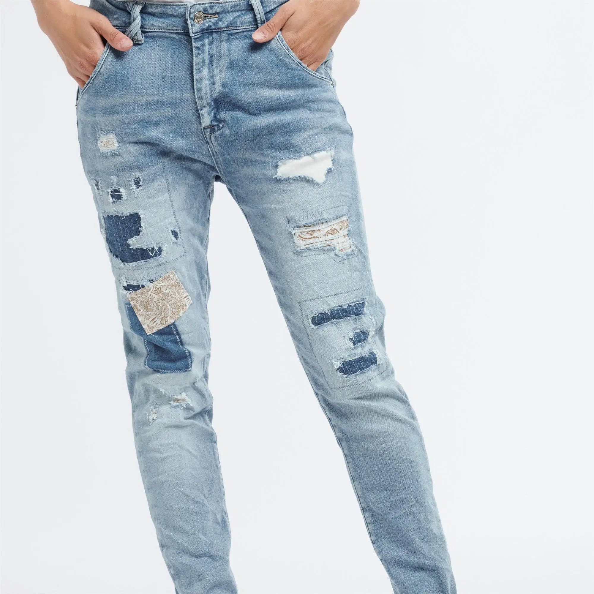 High Quality Light Blue Custom Logo fit Legs Patch Ripped Vintage Washing Spot Custom Denim Men’s Distressed Washed Jeans