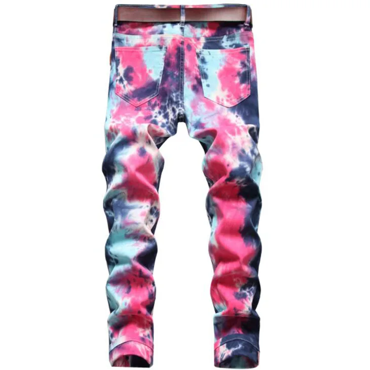 Fashion Mens Fancy Color Tie Dye Print Jeans Autumn Slim Straight Stretch Denim Pants Painted Trousers For Men