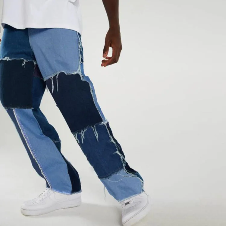 Vintage Style Men Straight Leg Denim Pants Casual Patchwork Men Stitching Straight leg Trouser Retro Loose Pants for Men