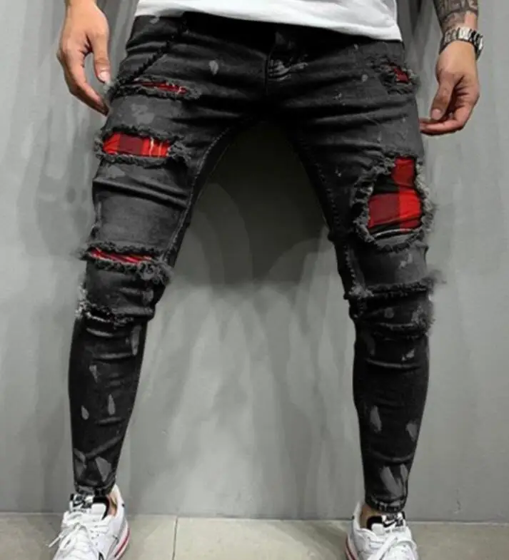 Men’s Slim Fit Knee Hole Jeans Distressed Shabby Pants Art Patches Skinny Biker Black Jeans Slim Trousers