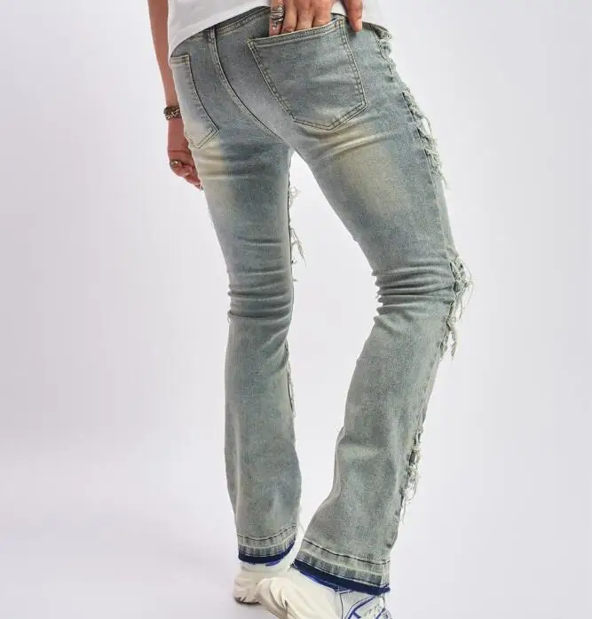 High Quality Trendy Stacked Pants Wholesale Tight and Perforated Men’s Jeans Street Straight Denim Pant