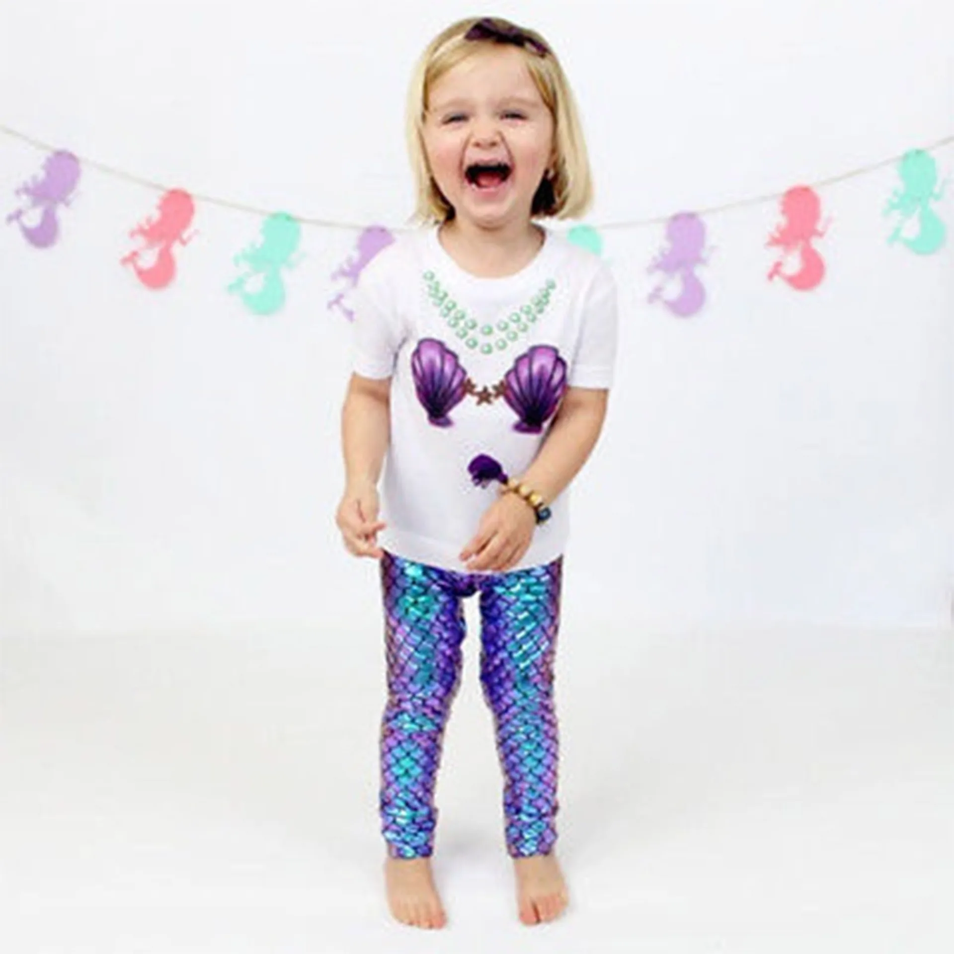 p20933 Baby Girls Clothes Mermaid Fish Scale Stretch High Waisted Leggings Pants Tights Toddler Girls Shiny Leggings Summer