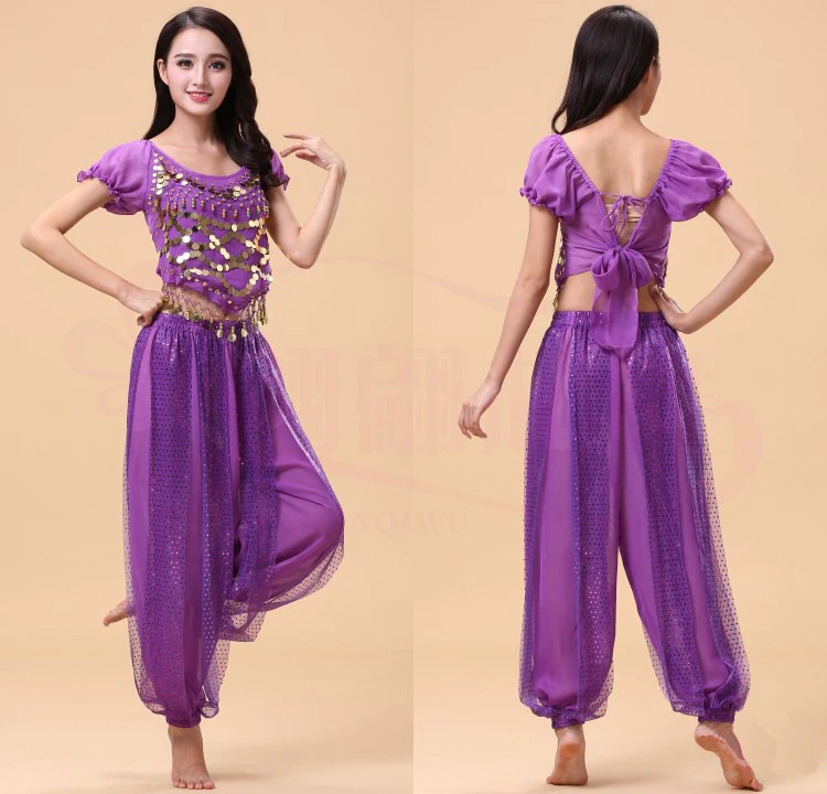 Sparkly Bollywood Indian Cosplay Outfits Sequin Puff Sleeve Crop Top with Harem Pants for Performance