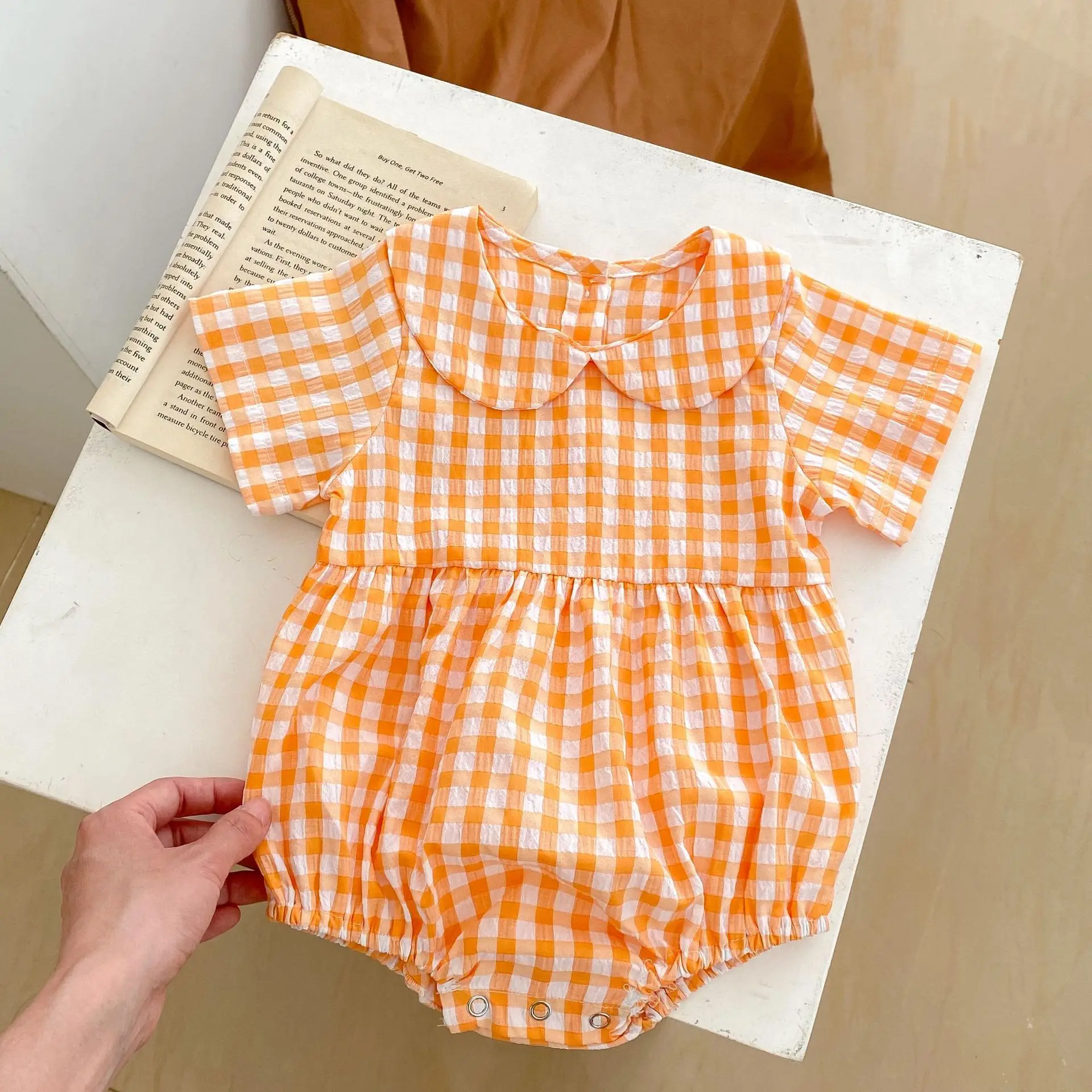 Summer New Infant Bodysuit Cotton Newborn Checker Romper Short Sleeved Baby Clothes