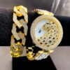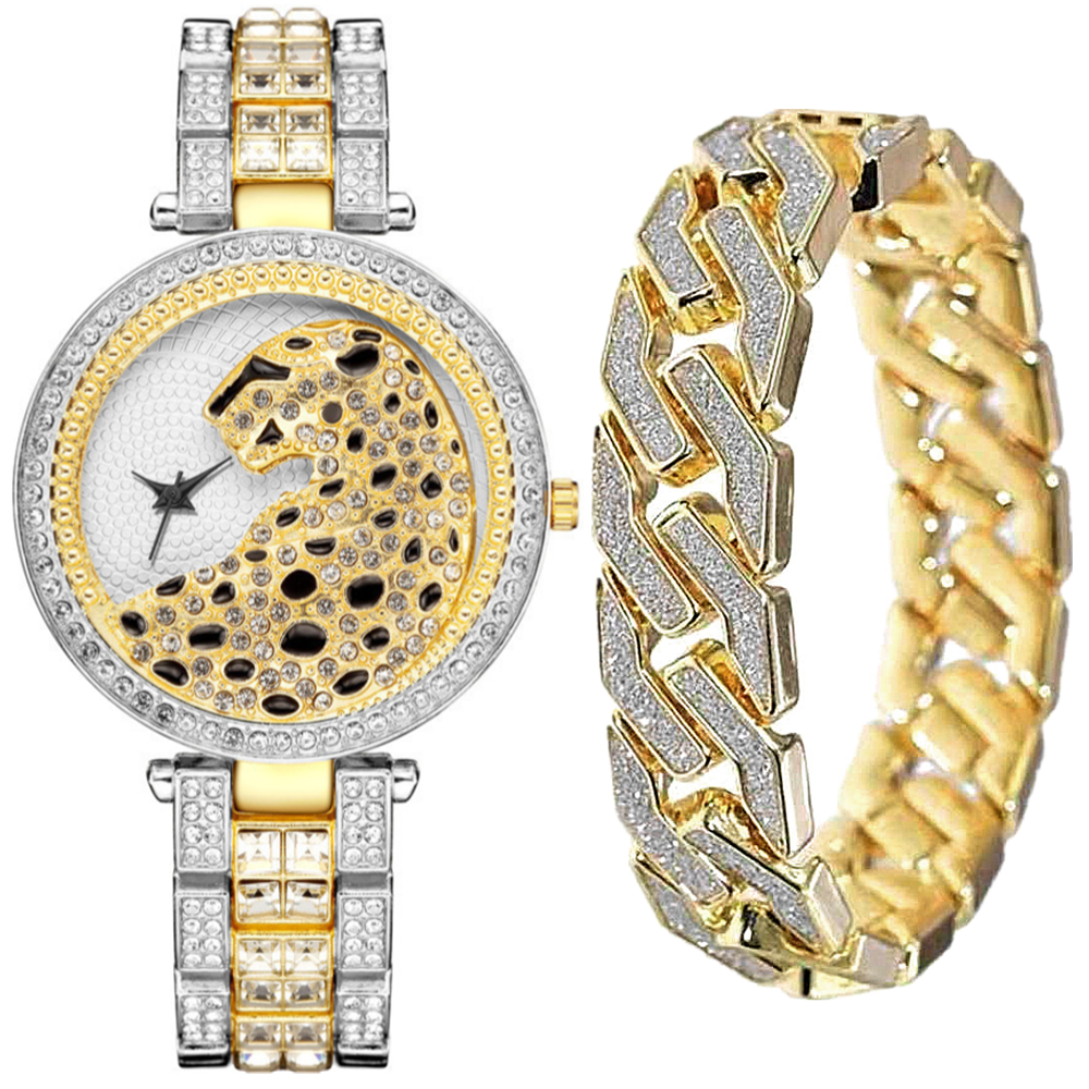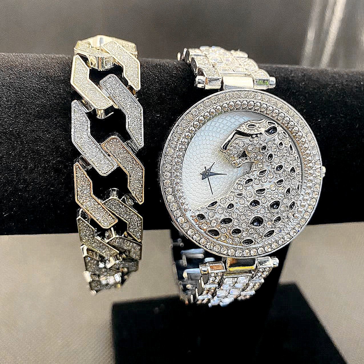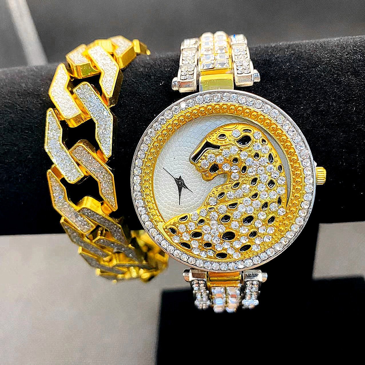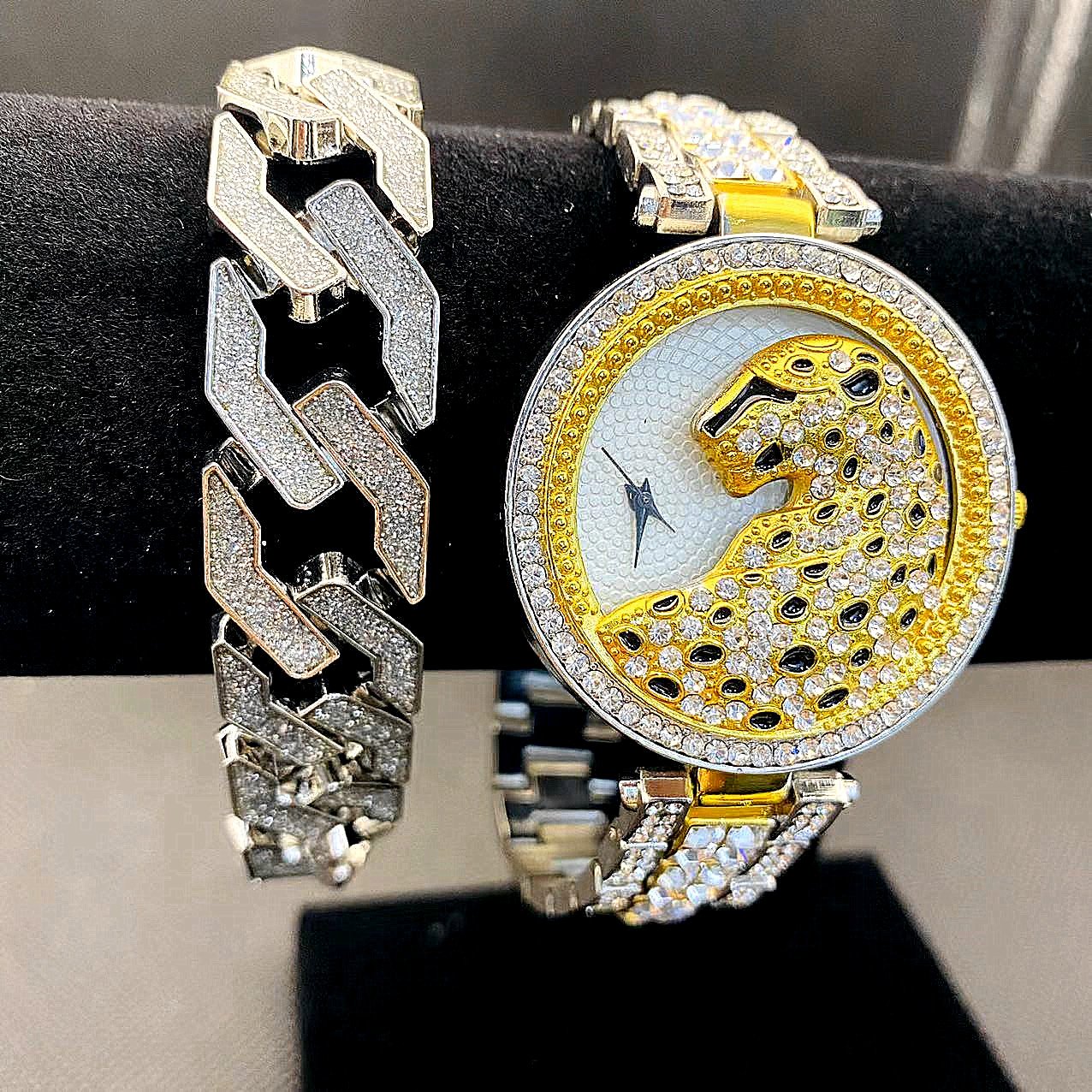 2pcs Iced Out Watch for Women Bling Watch Bracelet set Leopard Wristwatches Luxury Watch Woman jewelry Set Reloj Mujer