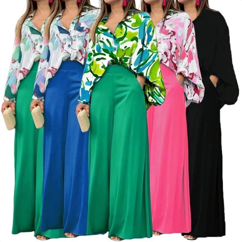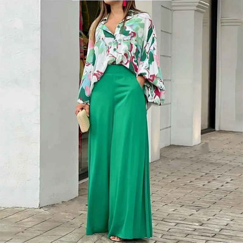Autumn Spring Women Casual Set Long Bat Sleeve Print Shirt + Solid Wide Leg Pants Conjunto Spanish Style Lady Two Piece Set