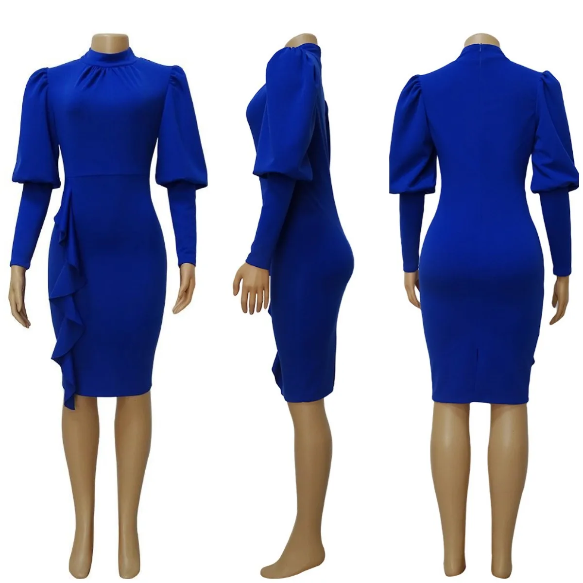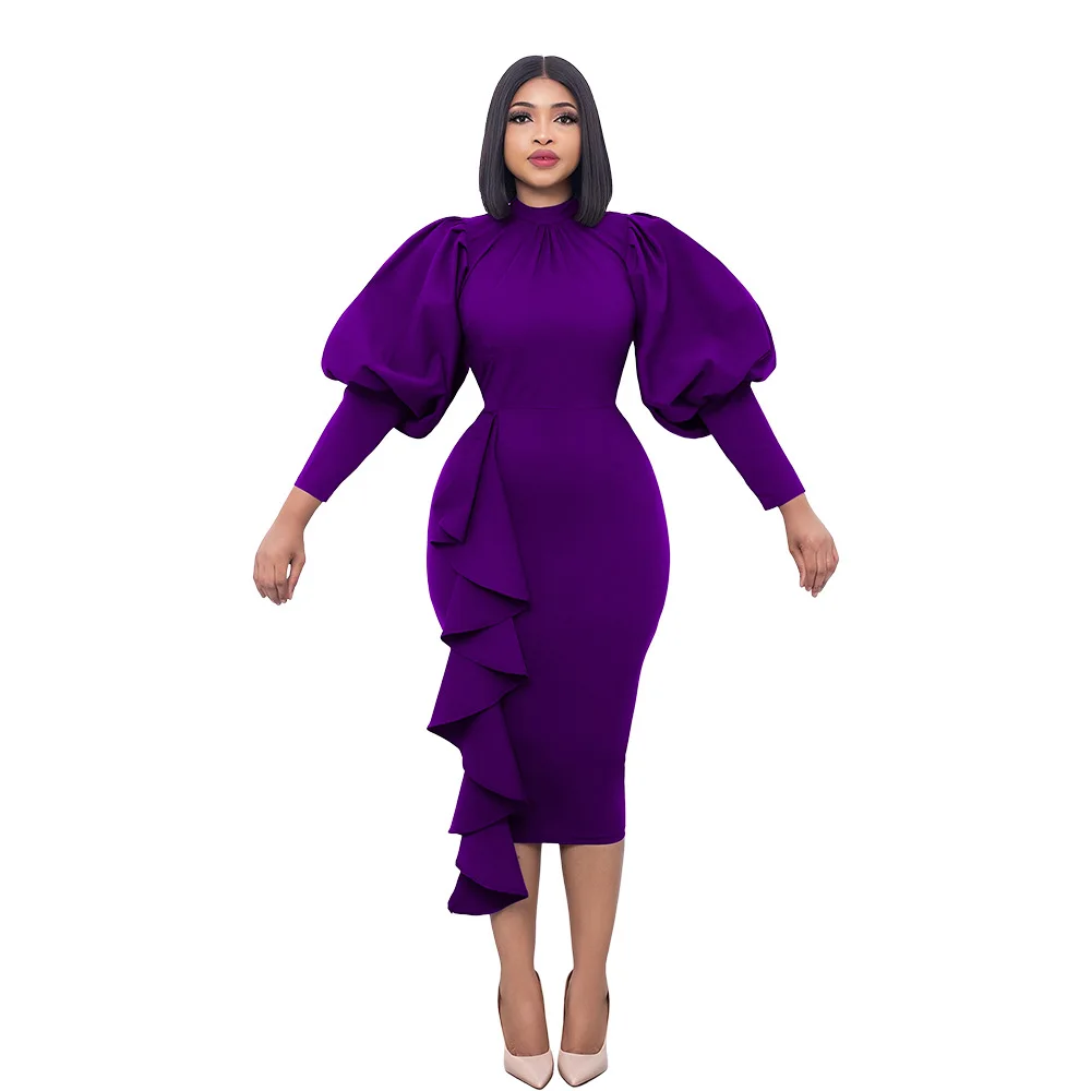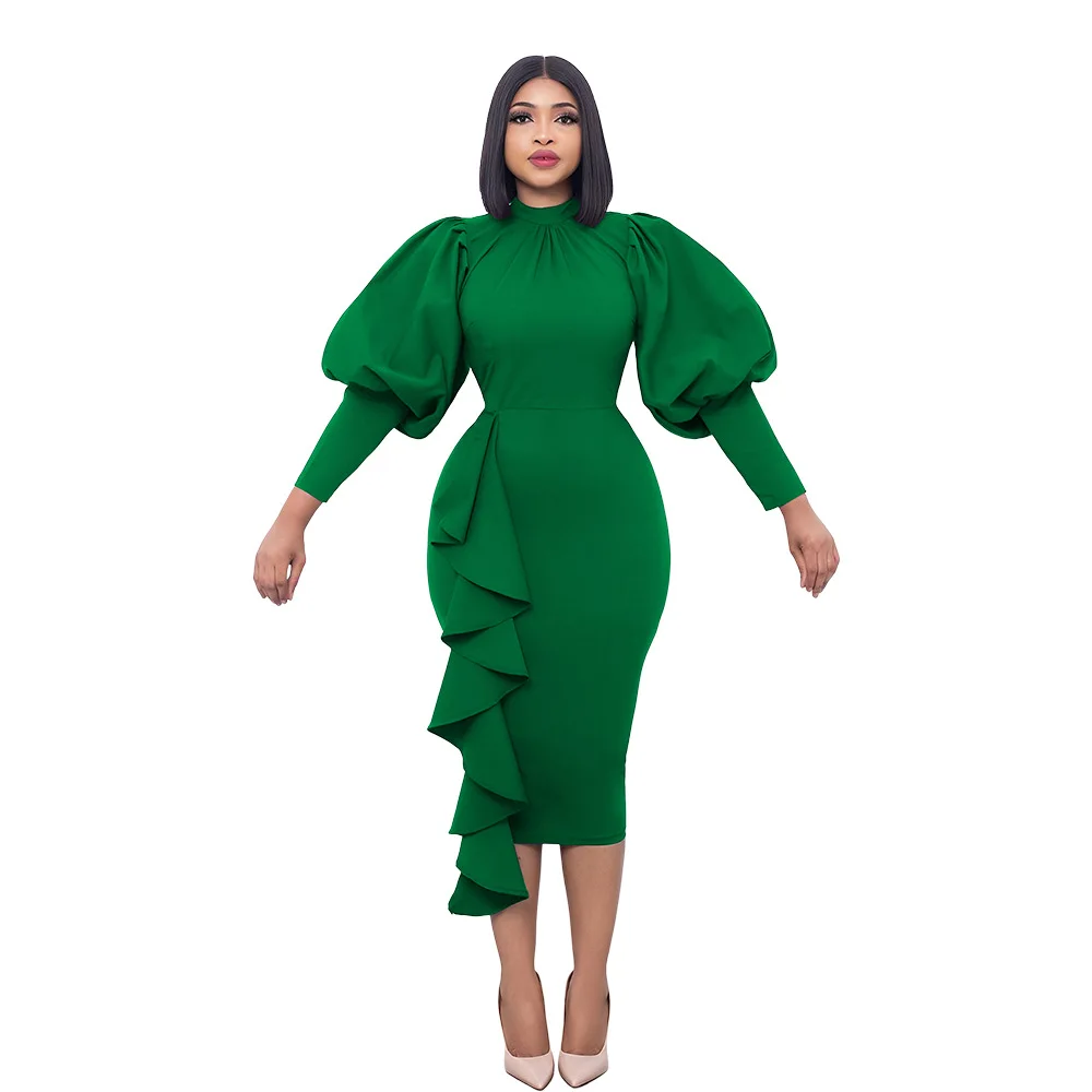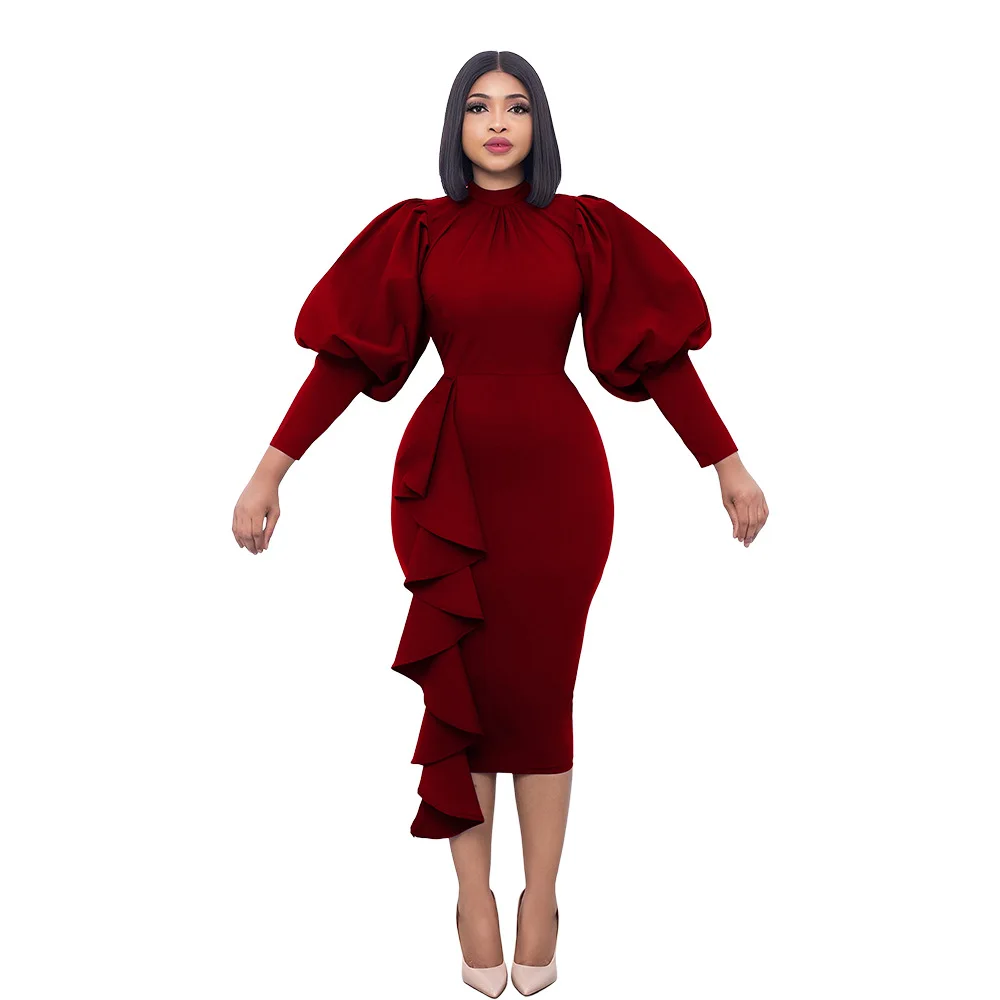 Autumn Spring Women’s Ruffle Dress Solid Stand Neck Lantern Sleeve Vestidos Office Party Elegant African Women Dress