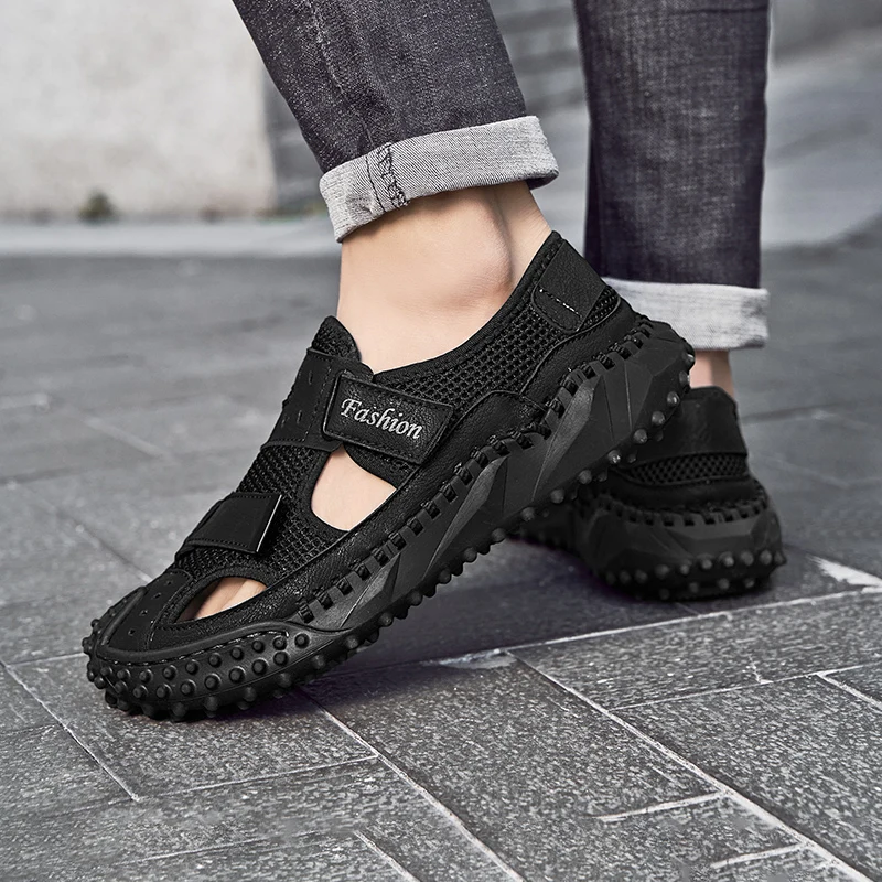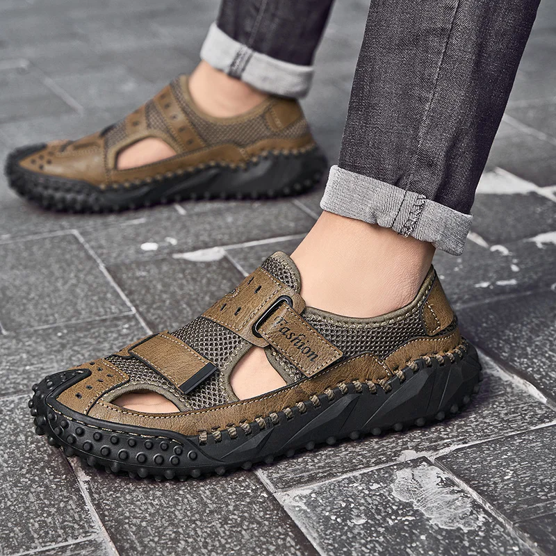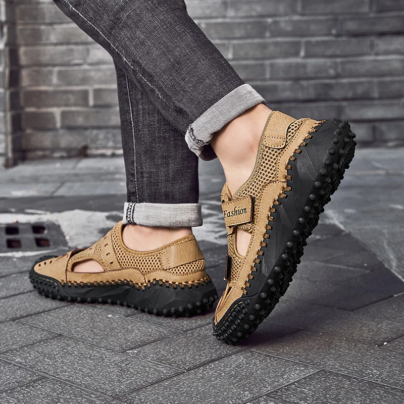 Custom Design OEM service mesh genuine leather sandals summer men sport beach closed toe sandals