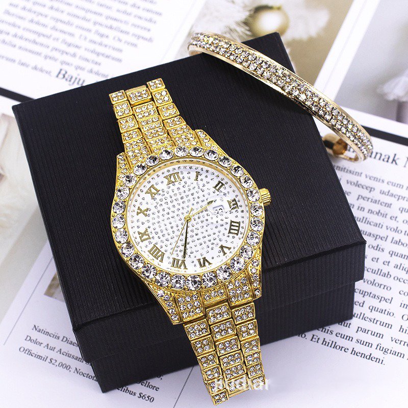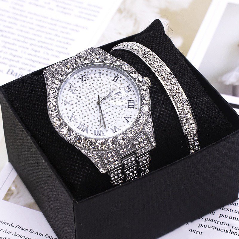 Diamond Watch for men gift set Luxury iced out watches for woman Miami Cuban Chain Hip hop Quartz Watches For Men jewelry sets