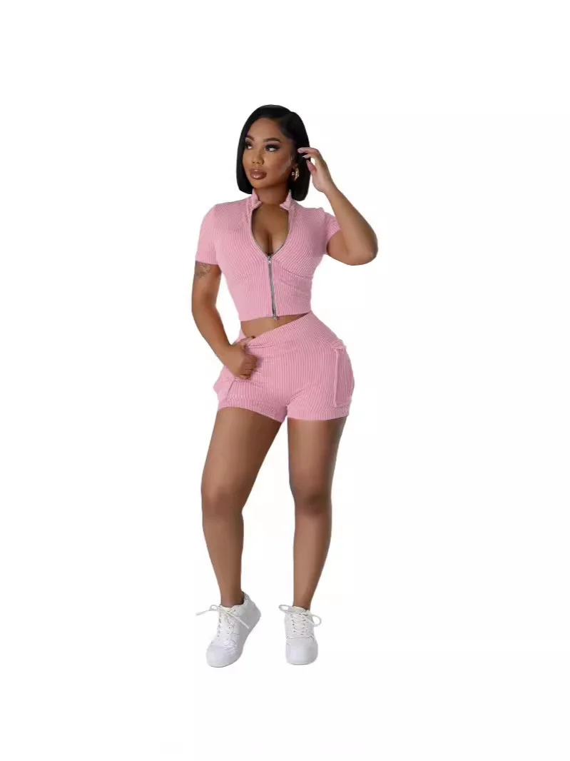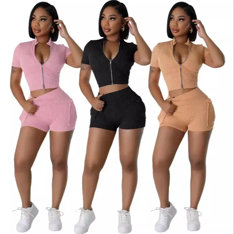 MNY8172 new arrival summer fashion women loungewear two pieces sets sexy solid zipper set casual clothes for women