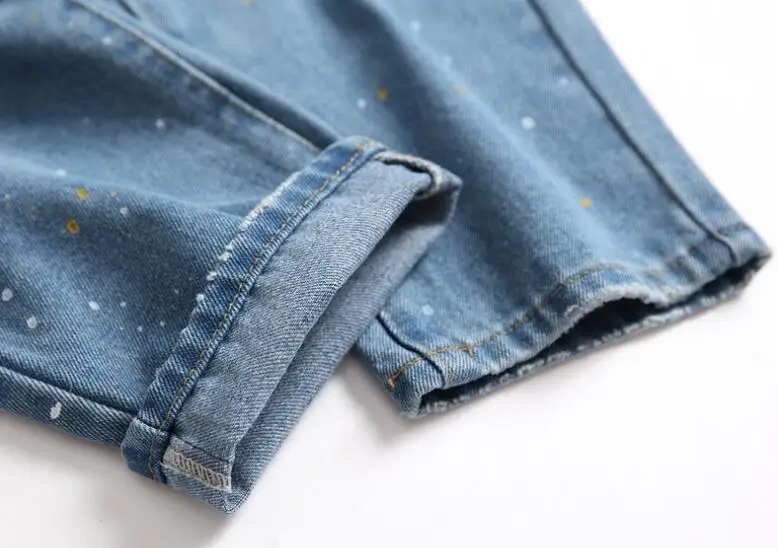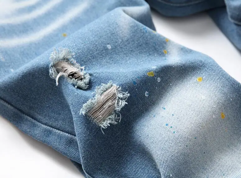 New men stacked jeans Splash ink print distressed denim jeans vintage ripped blue men slim fit jeans
