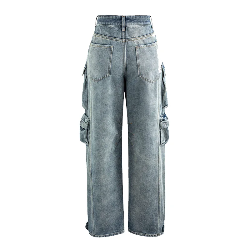 OEM Top Quality Manufacturers Wash Jeans Multiple Cargo Pockets Decorated Sky Blue Cutout Design Wide Leg Pants