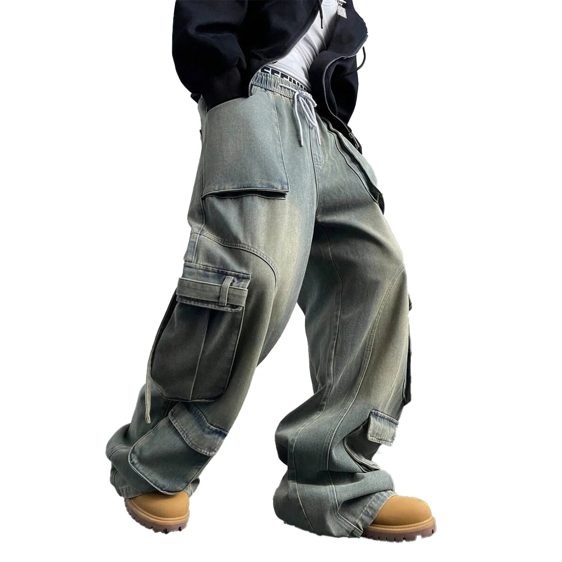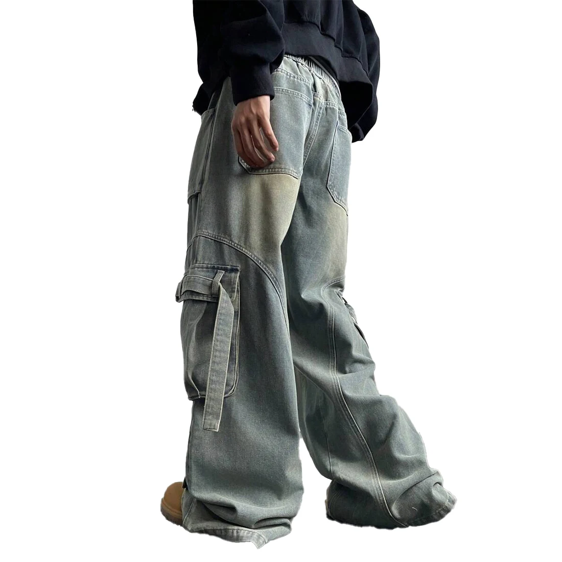XUCHANG Custom Streetwear Men Baggy Monkey Washed Denim 3D Effect Cargo Pockets Jeans Pants Men