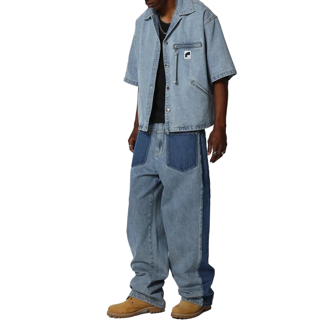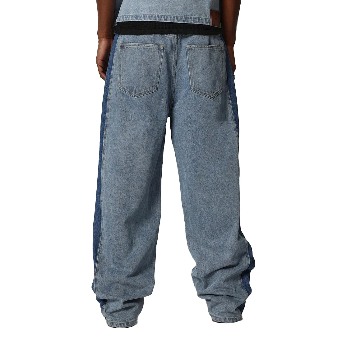 XUCHANG Men Custom Manufacturer Streetwear Baggy Denim Color Block Patch Pocket Side Panel Jeans Pants