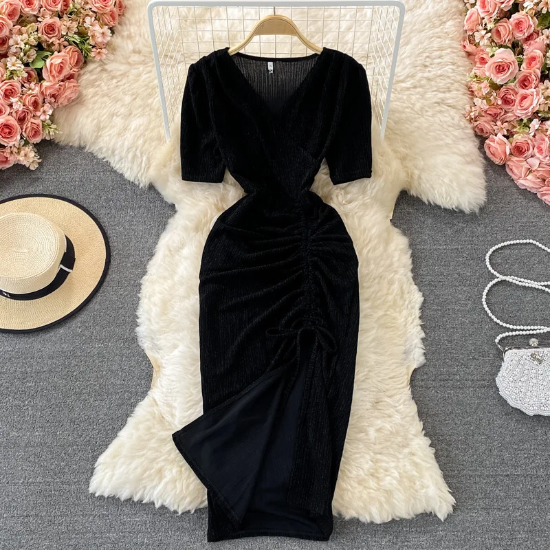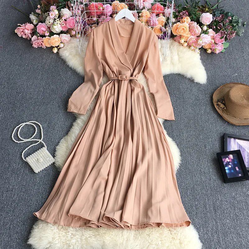 A406026 New Waist-controlled long sleeve dress v-neck One-piece large hem mid-long style pleated Casual Dress