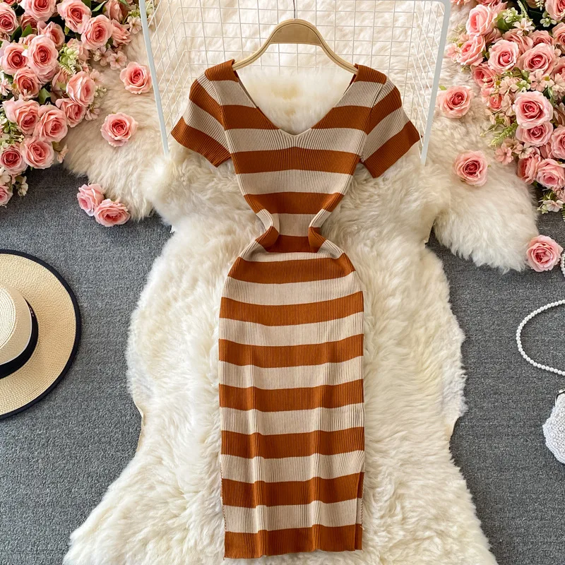 A406073 Women’s Casual Off Shoulder Short Sleeves Slim Bodycon Striped Sexy V-neck Knitted Dress