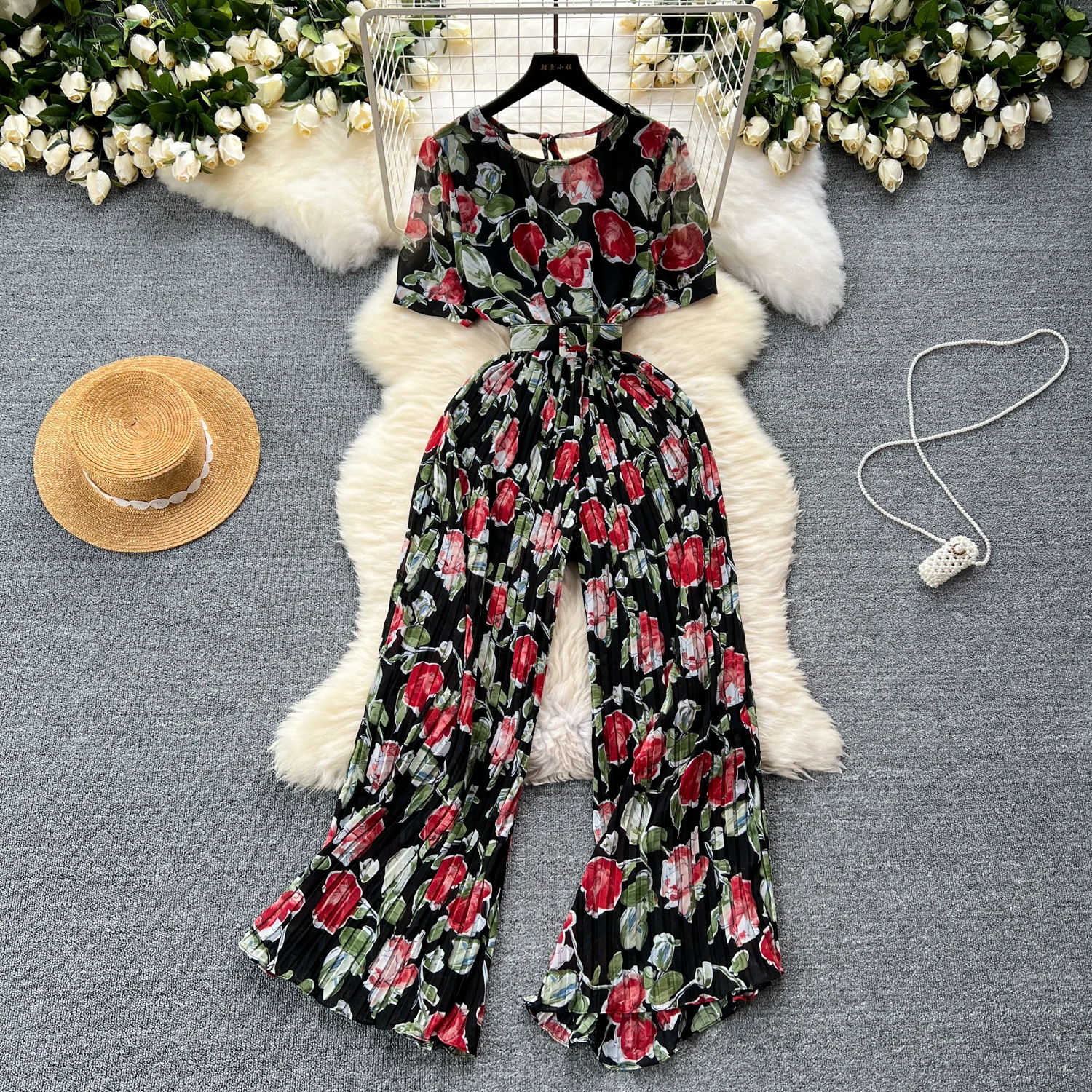 American Style O-Neck Tunic Jumpsuit For Women Puff Sleeve High Waist Floral Lace Long Jumpsuit Ladies Casual Overalls